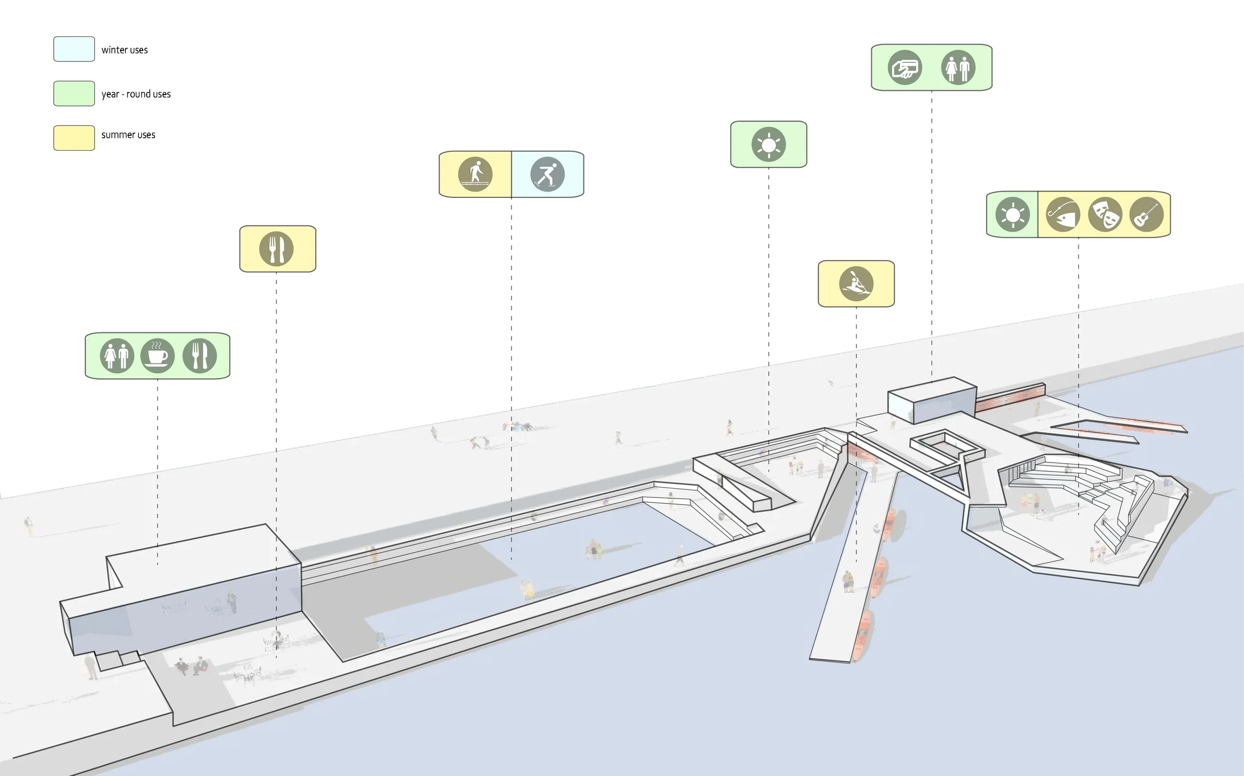 This kayak rental facility, located on Copenhagen’s harbor, was designed to provide public recreation space that could be used year round. This was achieved through the varying degrees of enclosure and diversification of program. While during the summer kayaks would be in the water and people would be soaking up sun on the wooden decks, in the winter the splash pool would transform into an ice rink. This functionality is a direct response to Denmark’s varied climatic conditions.